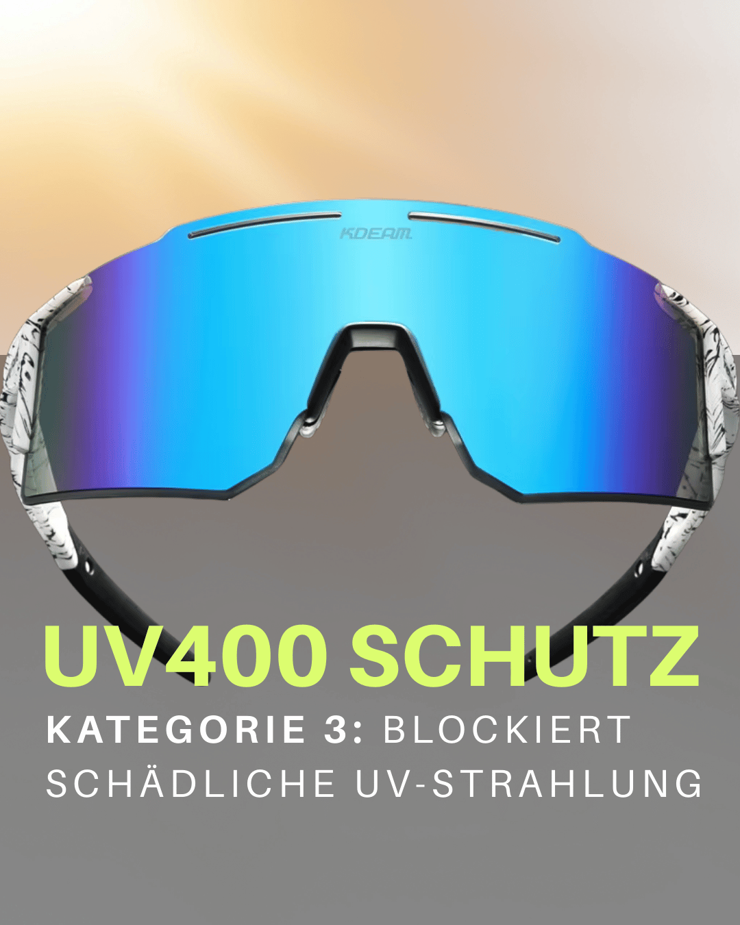 Der UV400-Schutz der Kategorie 3 blockiert schädliche UVA- und UVB-Strahlen und bewahrt deine Augen so vor langfristigen Schäden wie grauem Star. Damit genießt du bei jeder Outdoor-Aktivität zuverlässigen Schutz und maximale Entspannung für deine Augen, selbst bei direkter Sonneneinstrahlung. Auch Gegenwind, Staub oder Insekten können deine Augen nicht austrocknen oder verletzen.