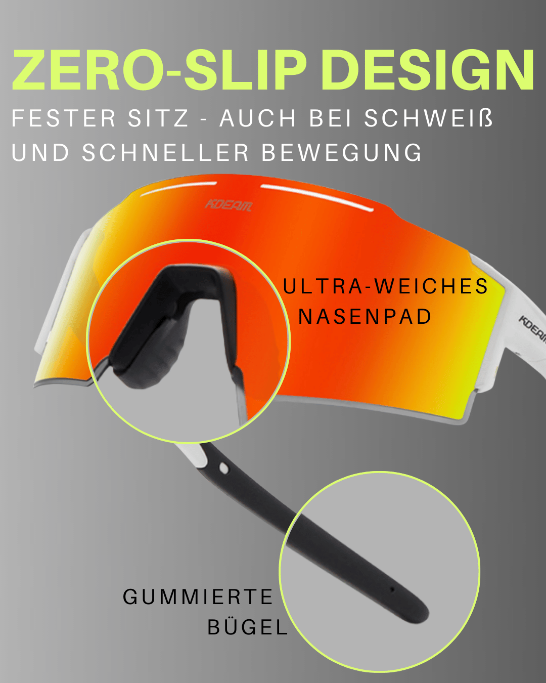 Mit gummierten Bügeln und einem ultra-weichen Nasensteg bietet das Zero-Slip Design einen bombenfesten Sitz, der sicherstellt, dass die Brille selbst bei intensiven Bewegungen oder starkem Schwitzen nicht verrutscht. So genießt du maximale Bewegungsfreiheit und einen druckfreien und dennoch festen Halt, auf den du dich bei jedem Workout verlassen kannst.