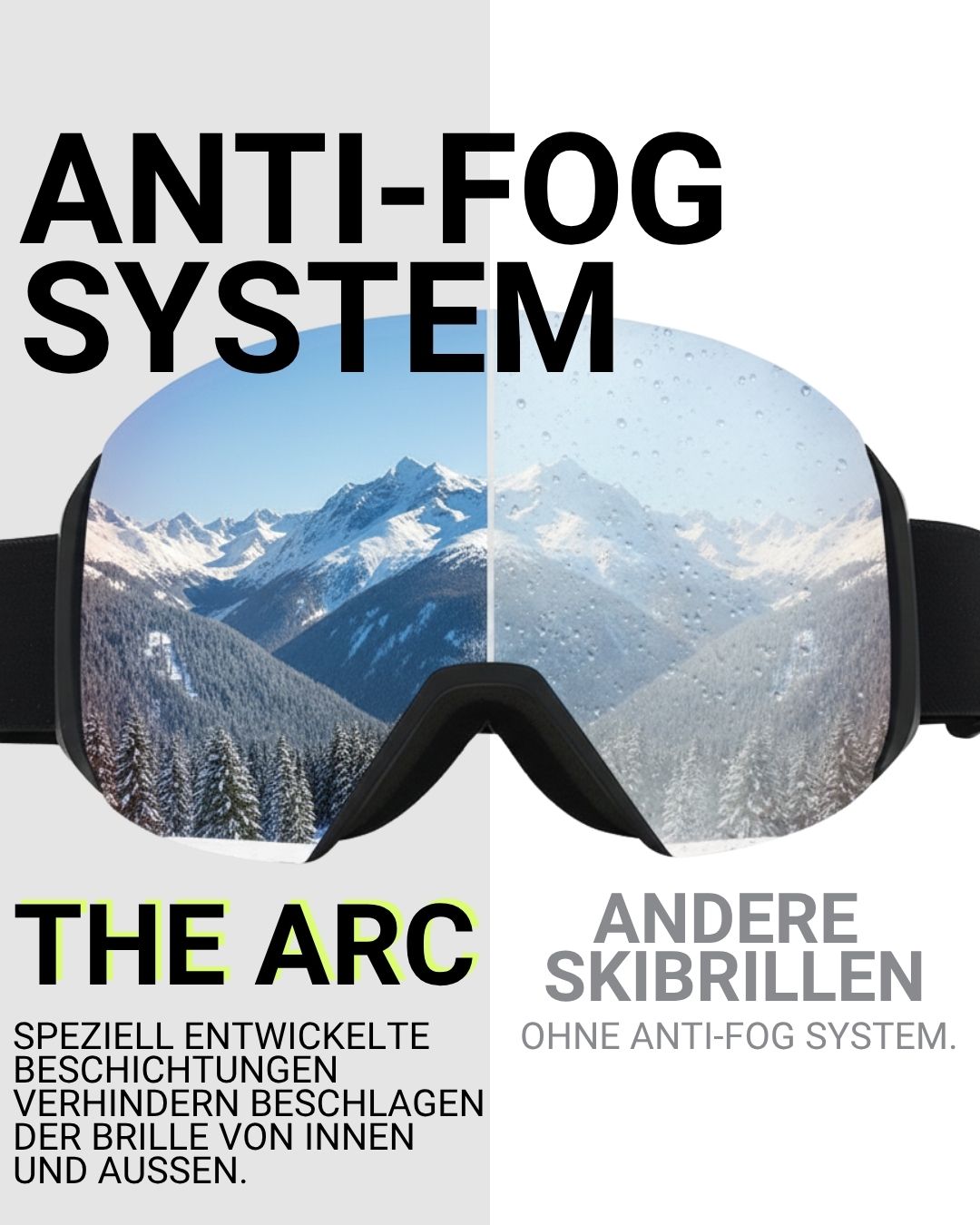 Die hochwertige Anti-Fog-Beschichtung sorgt für eine dauerhaft klare Sicht – egal, ob bei Schneefall, Kälte oder hoher Luftfeuchtigkeit. Zusätzlich sorgt das Lüftungssystem für eine angenehme Luftzirkulation in der Brille.