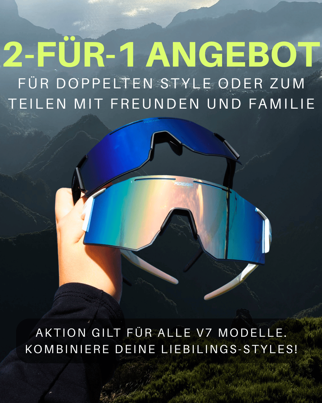 Sichere dir jetzt zwei stylische v7 Sportbrillen zum Preis von einer und profitiere von unserem limitierten Bundle-Deal, bevor deine Lieblings-Styles ausverkauft sind. Gönn dir zwei Looks oder mache deinem Lauf-Buddy ein smartes Geschenk.